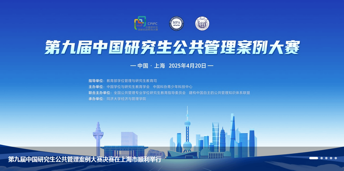2025年4月20日,第九届中国研究生公共管理案例大赛在同济大学落幕。中国研究生公共管理案例大赛是“中国研究生创新实践系列大赛”主题赛事之一,是我国公共管理领域研究生的最高级别赛事。第九届中国研究生公共管理案例大赛于2024年12月启动,吸引了来自全国>268所院校的3115支队伍、1.53万人报名参赛。公共政策与管理学院在此次赛事中取得佳绩。本届大赛学院共提交14个案例文本,参赛队伍分别获案例类优秀奖3项,调研报告类二...