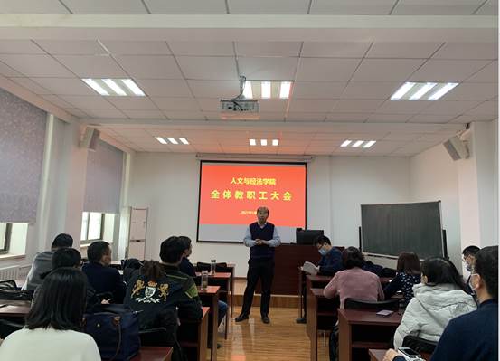 随后,刘晨光院长通报了学院更名情况,依据校人字[2021]15号《关于人文与经法学院更名为公共政策与管理学院的通知》,学院正式更名为公共政策与管理学院,他表示,学院更名将有利于进一步整合学科力量、凝聚学科方向,要在此基础上争取尽快获批博士点,为学院发展创造更好的环境。他还希望大家能结合自身工作及规划,积极为学院发展建言献策,共同推动学院的快速发展。
