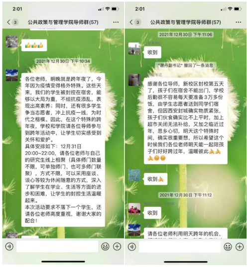 2022年的元旦如期而至,但西安人民的生活节奏却因为一场突如其来的疫情被打乱,为了防疫大局早日实现清零,西安市全体居民配合要求足不出户,西北工业大学的同学们也被封控在宿舍,平时的学习和工作只能在线上进行。为了了解同学们近期的学习和科研状况,同时安抚大家的情绪,公共政策与管理学院原嫄副院长和谢丹副书记倡导各位研究生导师与学生线上相聚,了解学生近期在学习、科研等各方面的进步和困难。这一倡议得到了学院导师们的一致支持。