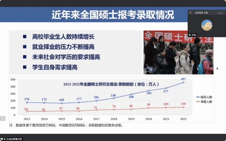 2022年10月24日,公共政策与管理学院2023年全国硕士研究生招生考试交流会暨考研动员会于线上顺利召开。研究生招生办主任王会、学院党委副书记谢丹、副院长原嫄、学院研究生秘书、往年考研优秀学生代表及在校部分师生参加此次会议。