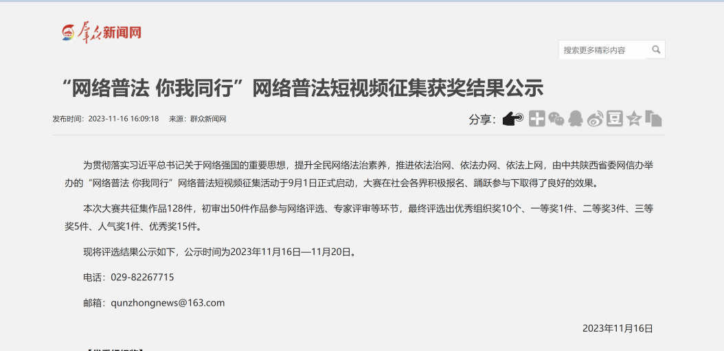 2023年9月1日,中共陕西省委网信办启动了“网络普法 你我同行”网络普法短视频征集活动。在学校宣传部的大力支持下,公共政策与管理学院本科生的四组作品经遴选后参与本次征集活动。根据近日公布的评审结果,本科生王姿懿、周志伟、朱琳的参赛作品《算法西游》荣获本次比赛唯一的一等奖,西北工业大学荣获优秀组织奖。