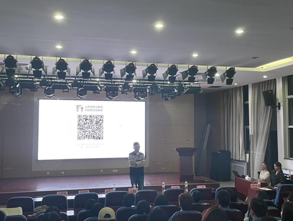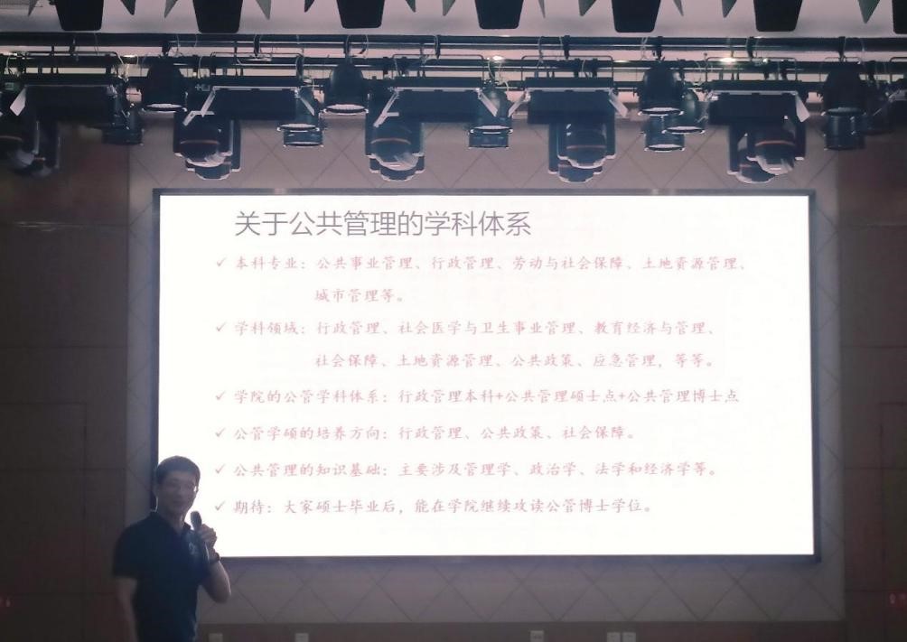第一位是公共管理系主任——寇晓东副教授,他热烈欢迎了各位研究生新生的到来,并详细介绍了公共管理的学科体系,多角度多层次地展开讲述公共管理的学科师资,鼓励同学们做好科研、为未来继续攻读博士研究生做好目标设想,并对大家提出了殷切期望:告别大学本科四年,开启学者生涯。