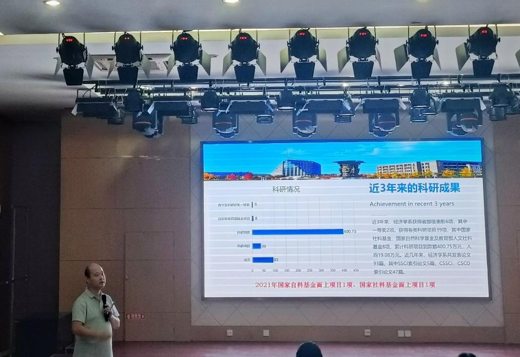 第二位是经济学系主任——袁晓军副教授,袁老师详细介绍了我院经济学系的基本情况,并通过大数据展示了目前的经济学领域的研究热点以及经济学系的研究聚焦(方向)。谈话间,幽默风趣中饱含哲理,短短几十分钟的汇报蕴含着无穷的启示,在场的同学都反响积极,一片欢声笑语中气氛活跃,又收获颇丰。
