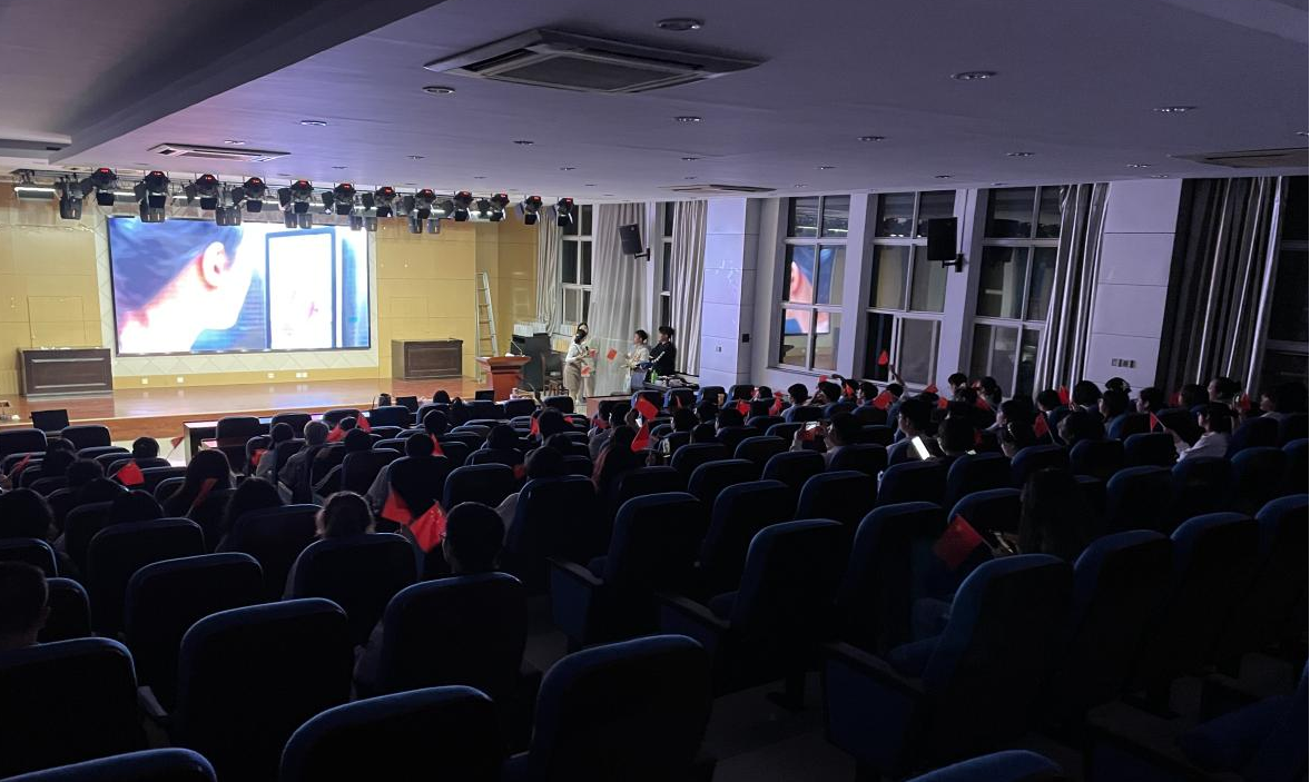 期间,为庆祝国庆的到来,全体学生们深情合唱了《我和我的祖国》。师生挥动着手中的国旗,看着大屏幕播放的这一年里中国的种种成就。师生在歌曲中抒发着自己的爱国之情,体会着国家之强大所带来的幸福生活。