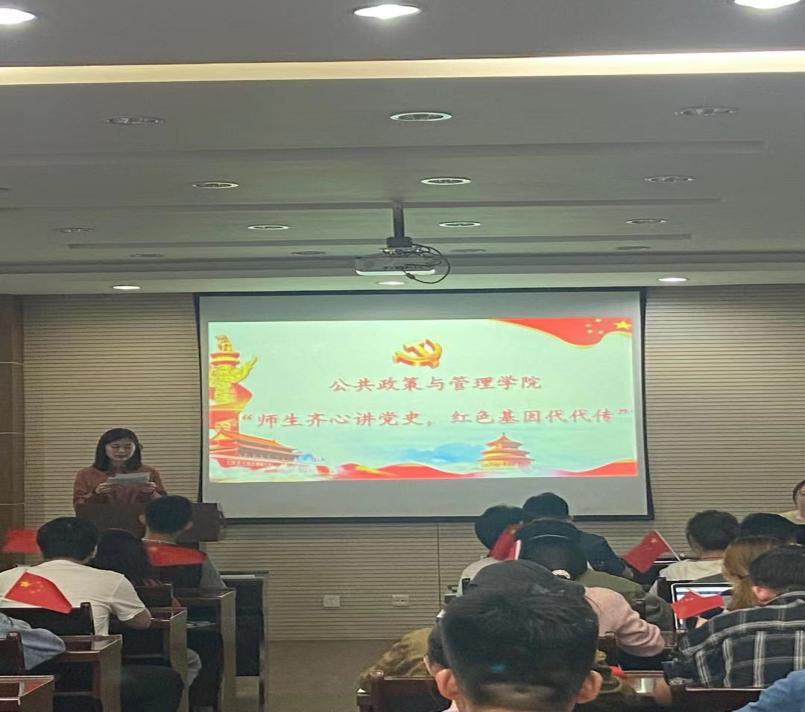 为庆祝中国共产党成立100周年,深入贯彻落实中共中央关于党史学习教育的重要部署及习近平总书记在党史学习教育动员大会上的重要讲话精神,公共政策与管理学院研究生会及各年级研究生代表于2021年9月29日晚举办“师生齐心讲党史,红色基因代代传”活动。本次活动主要由四个环节构成:老师讲党史,追溯发展来路;学生讲党史,分享所学所思;观看《伟大征程》片段,互动感受红色基因;全体合唱《我和我的祖国》,抒发爱国主义情怀。
