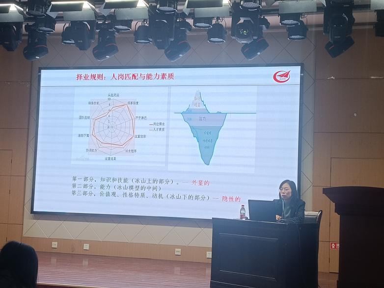 接下来,张玲对职业管理和从业抉择方法展开介绍。她提到,新时代航空工业人才发展体系下,科研任务和生产任务都对人才有着大量需求。希望我院学生在就业竞争激烈的当下应当做到学识广博、兼收并蓄,了解各类形势,准确分析态势,把自我认知放入内外部环境关系中来,不断提升自己,应对挑战。