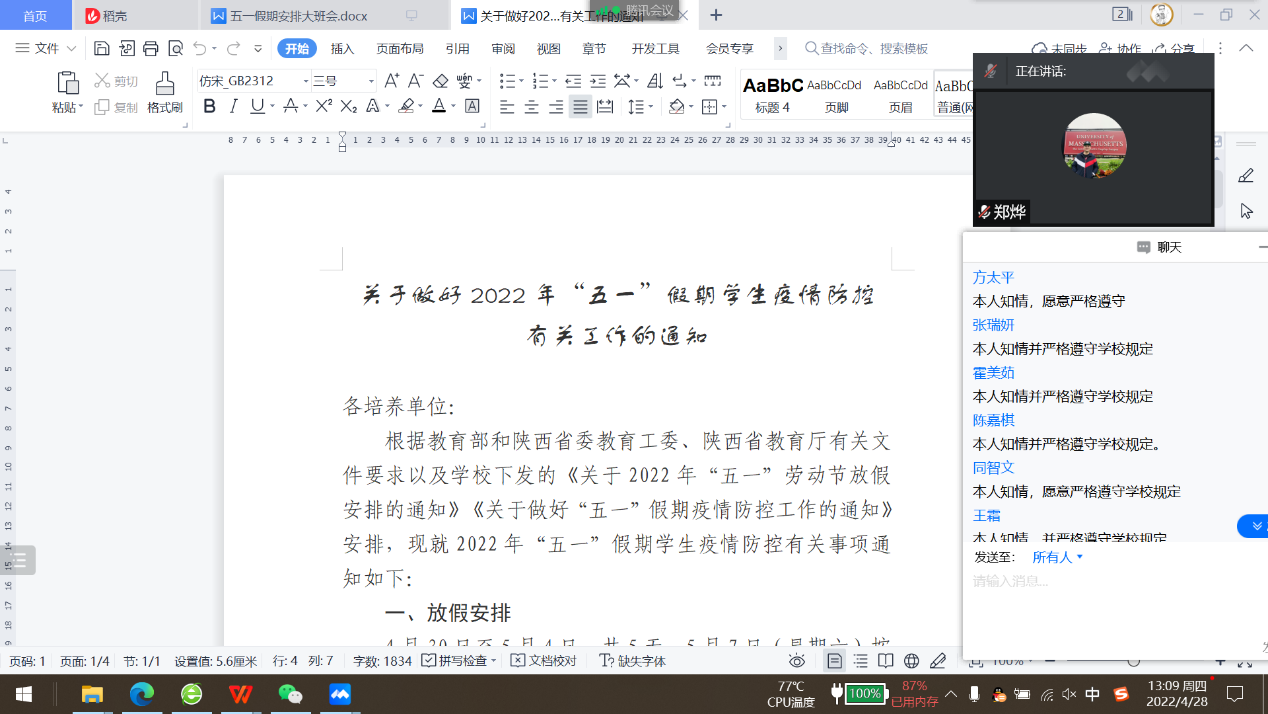2022年4月28日中午12:40,公共政策与管理学院线上举办了研究生“五一”假期疫情防控和安全教育工作大班会,本次大班会由研究生辅导员郑烨老师主持,研究生兼职辅导员吴静静携学院全体全日制硕士研究生参与。根据教育部和陕西省委教育工委、陕西省教育厅有关文件要求以及学校下发的《关于2022年“五一”劳动节放假安排的通知》《关于做好“五一”假期疫情防控工作的通知》安排,本次大班会主要分为以下三个部分: