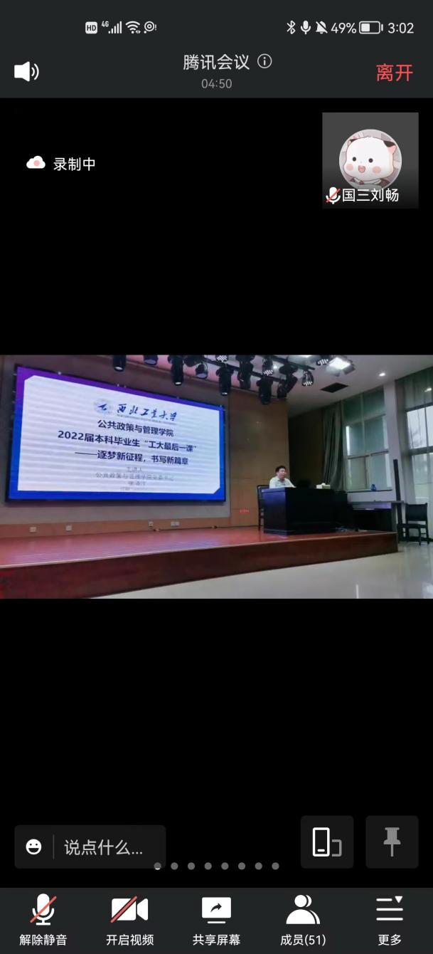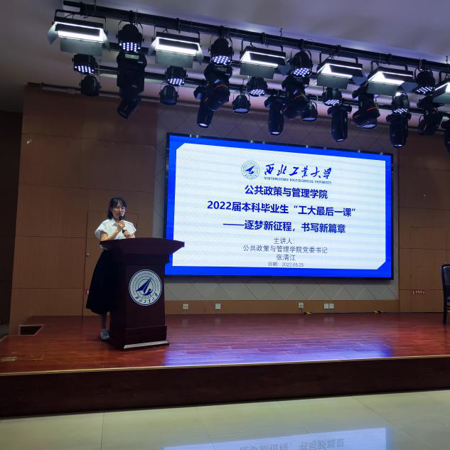 2022年5月25日下午3点,西北工业大学公共政策与管理学院2022届本科毕业生“工大最后一课”于207报告厅顺利进行。课程由2022届毕业生辅导员杨卓尔老师主持,公共政策与管理学院党委书记张清江主讲。