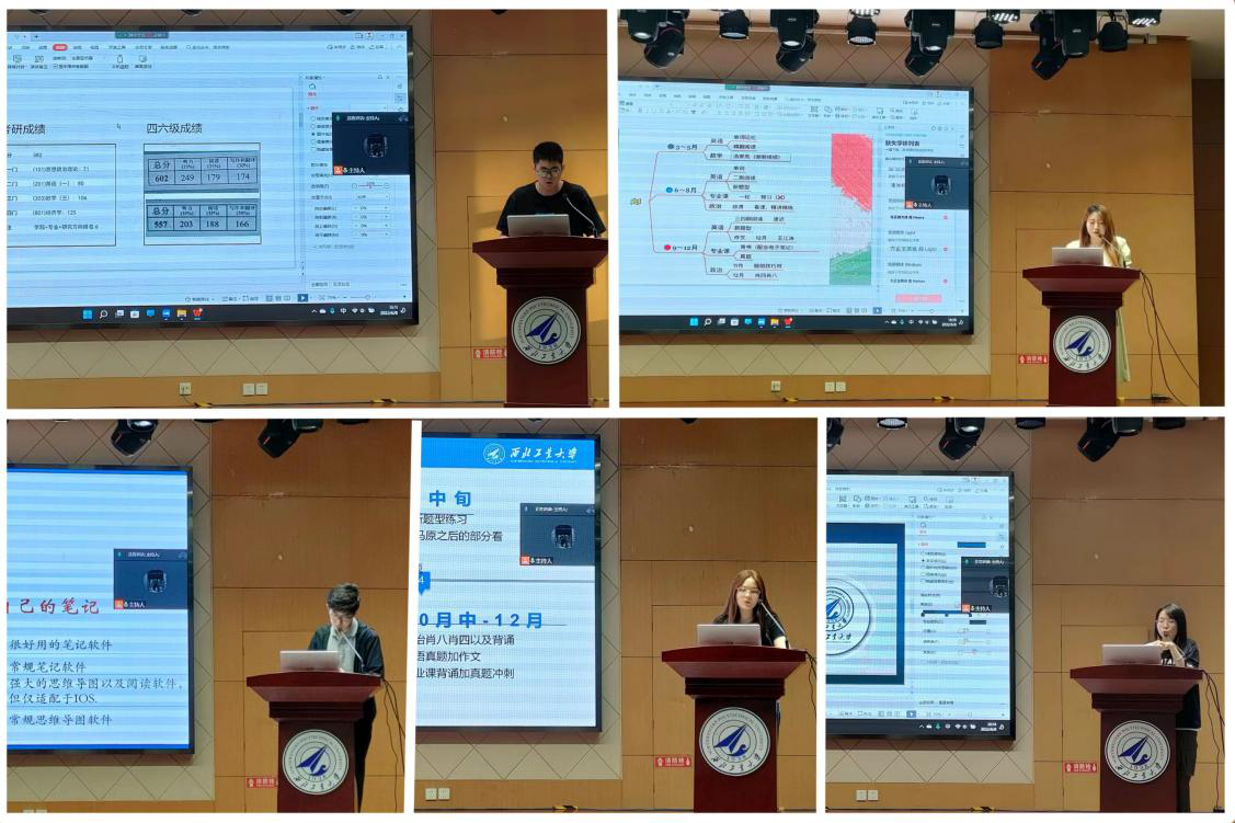 “考研经验分享交流会”分会场共邀请了五位优秀毕业生进行经验分享。分别从所学专业出发,分享政治、英语、专业课的备考建议,勉励同学们要把握时间,制定计划开展考研复习。考上东北财经大学的赵石琦指出,择校应当选择适合自己的,切忌“眼高于顶”,依据自己的能力匹配心仪的院校;考上西北工业大学的张婧雪建议同学们第一遍复习专业课时就要认真钻研,避免走马观花,注重备考期间的心态调整;以全国第一名的优异成绩被浙江大学光华法学院民商法学顺利录取的陆效民,分享了在考研时的小技巧,要重视指定的参考书目,并进行发散性思考;考上吉林大学法学院的王宁宁提出,法律硕士的备考区别于法学硕士,要在专业课方面更具针对性开展学习,查漏补缺;考上华东政法大学的程佳乐指出,部分法学类院校对于专业课的要求较高,同学们应当注重统筹时间,合理分配各科复习时间,在备考时也要关注身心健康。