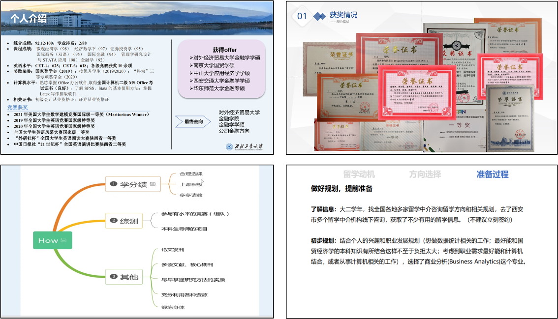 “就业、保研、出国申请经验分享交流会”分会场共邀请了八名优秀毕业生进行经验分享。保研至对外经济贸易大学的陈依凡以及保研至西安交通大学的张书馨从专业课成绩、英语学习、科研论文、竞赛奖项以及实习经历等多个方面总结保研加分项;保研至西北工业大学公共政策与管理学院的李文君以及吴晓琳则详细介绍了我院的综测保研政策、保研录取情况以及前期的准备工作等;前往香港大学进一步深造的杨宇晨从留学动机、方向选择和准备过程三个方面详细介绍了留学经验,鼓励同学们在平衡保研、考研以及出国压力的情况下,根据个人兴趣以及职业发展规划作出正确选择;入职中兴通讯股份有限公司的龙一阁、李强以及入职招商银行股份有限公司西安分行的耿炜晔则分别从就业单位选择、笔试面试注意事项、劳动合同签订等多方面介绍了求职就业经验。
