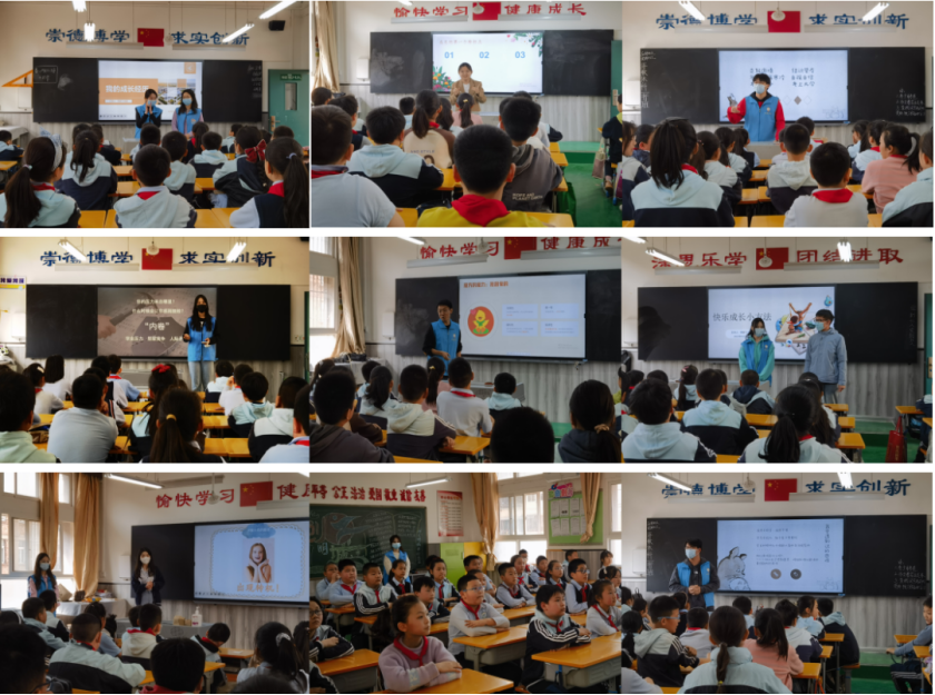 志愿者们分组前往四年级、五年级和六年级的课堂中,开展启迪分享课程。在四年级课堂中,胡恩、李鹏飞为学生们带来了“快乐成长小方法”,让学生们懂得分享快乐、换位思考、理解包容等与人愉快相处的重要方法;尚扬、刘依宁从自身的成长经历谈起,为孩子们讲授了缓解心理压力、自我疏导调节的方法。