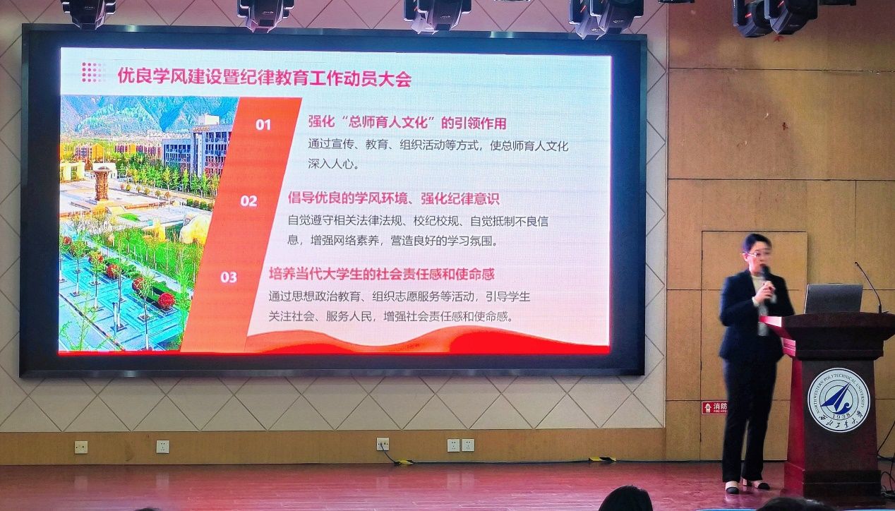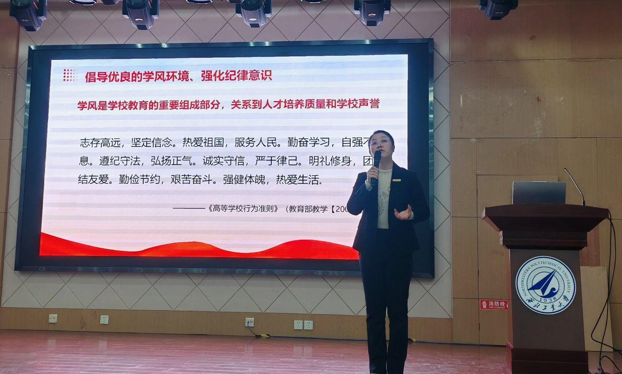 结合学生工作实际,田静婷老师强调学风是学校教育的重要组成部分,关系到人才培养质量和学校声誉,纪律是规范学校学生管理,维护学校正常教育教学的重要基础。通过组织2023级全体学生学习《西北工业大学学生管理规定》,引导学生树立正确的安全责任意识,自觉遵守相关法律法规、校纪校规、自觉抵制不良信息,增强网络素养,培育风清气正的网络环境,营造良好的学习氛围。