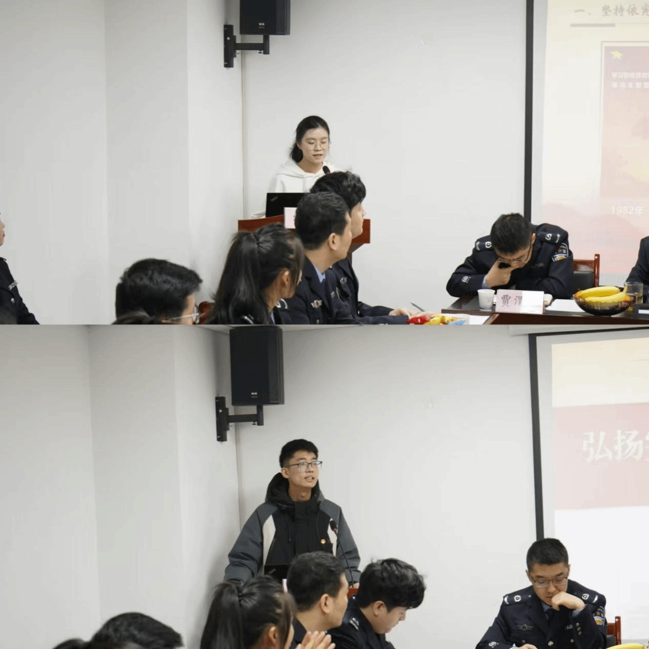 随后,双方共同召开交流会。会上,贾渭平为师生代表详细介绍了碑林区司法局2024年工作情况与相关成果,表示碑林区司法局将进一步以习近平法治思想为指引,展现司法行政新作为。随后,学院法学系学生林桂烨、徐路杭分别以“法治宪行,内外兼修”“弘扬宪法精神,夯实法治根基”进行习近平法治思想主题宣讲,展现出青年学子对法治建设的热情关注和深入思考,表达了自己选择法律、承担使命的青春梦想。