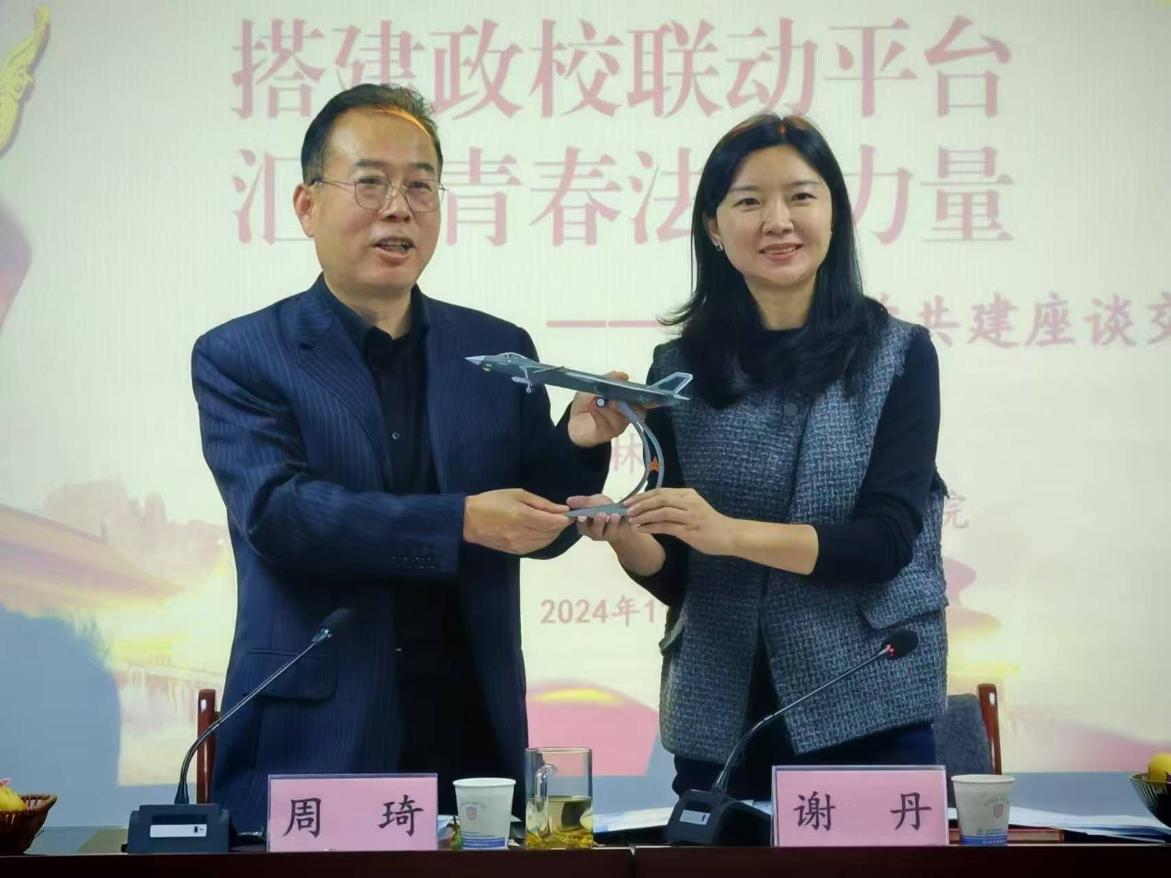 谢丹对碑林区司法局支持我院的教育工作表示感谢,表示学院将进一步推进思政育人、实践育人工作,未来将与碑林区司法局进一步深化合作交流,创新合作形式,推动学科教育提质增效。周琦做总结讲话,表示将与学院进一步深化合作交流、建设好联动平台,鼓励年轻人脚踏实地、勇担重任,将个人责任融入历史使命,成为有理想、敢担当、能吃苦、肯奋斗的新时代青年。最后,双方互赠航模、工大邮票、代表书籍等特色纪念品。