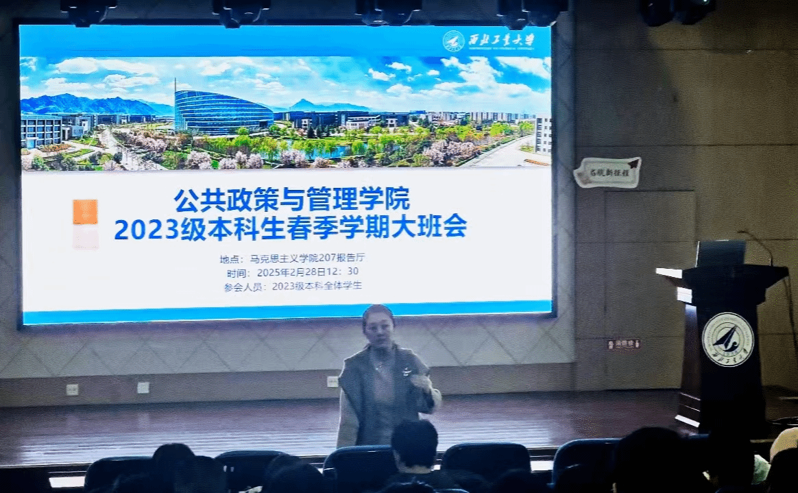 新学期新气象,为加强学风建设、提升学生网络安全意识,2月28日中午,公共政策与管理学院2023级本科生“学风引领成长、安全护航未来”大班会在学院楼207报告厅举行。会议由2023级本科生辅导员田静婷主讲,全体2023级本科生参会。