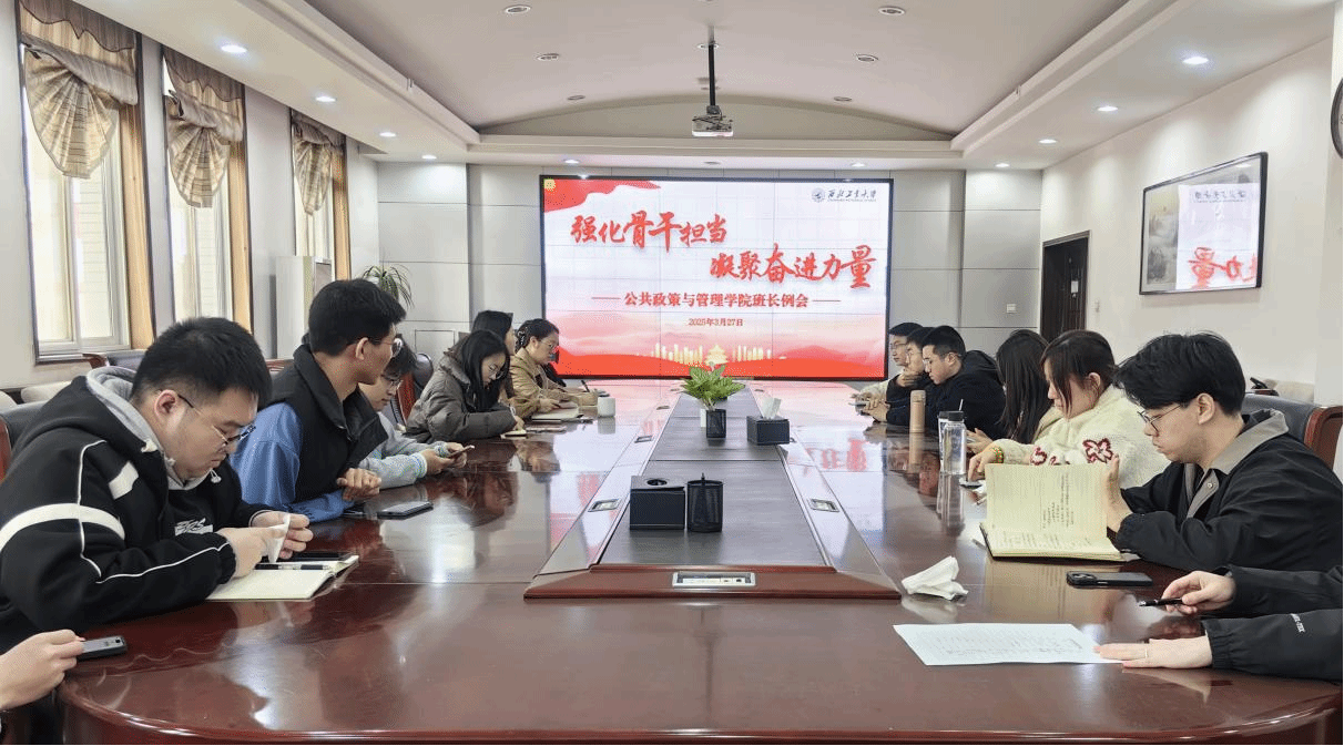 为推进学生工作有序进行、凝聚班级管理合力,夯实基层学生组织治理效能,3月27日下午,公共政策与管理学院“强化骨干担当 凝聚奋进力量”院班交流会在学院楼208会议室召开。本次交流会围绕优化班级管理模式、强化学风建设成效、切实提升学生服务质量以及推进学生积极参与基层实践锻炼等议题展开深入交流,学院党委副书记谢丹,2023级辅导员田静婷及全体班长参会。