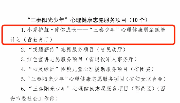 近日,在中共陕西省委社会工作部组织开展的“志愿三秦”省级志愿服务示范项目评选中,由学院学生团队主要实施、学校团委申报的“小爱护航·伴你成长——‘三秦少年’心理健康朋辈赋能计划”项目,经严格评审,成功获评为省级志愿服务示范项目(全省80个)。特此报喜!