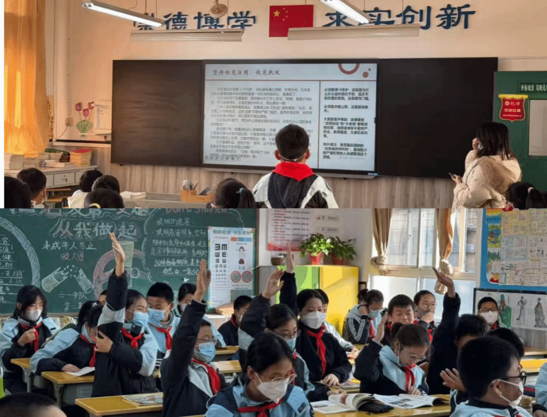 第三组聚焦《我的“守护盾牌”——认识<未成年人保护法>》。彭雅珺通过讲解传递法律对未成年人的保护意义,吴丹宁则组织开展了“12·4国家宪法日”知识抢答。孩子们踊跃举手、积极发言,在活跃的氛围中进一步理解了法律赋予他们的权利与保护。