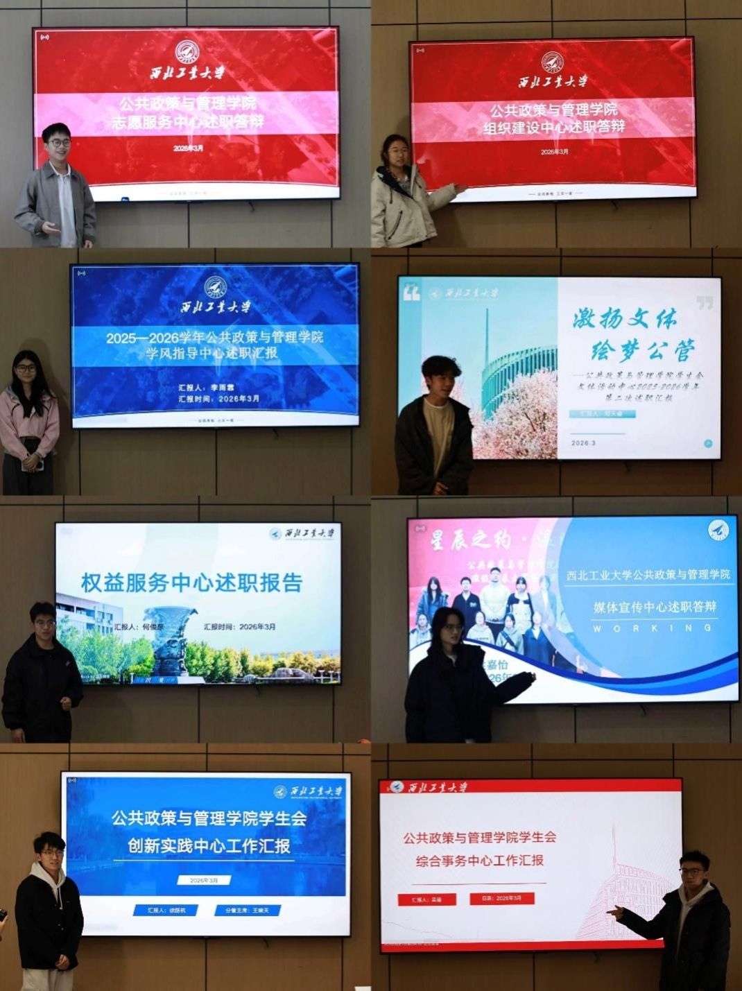 各中心负责人依次述职。组织建设中心聚焦团学工作,优化培训体系;志愿服务中心“小爱护航”项目入选省级学雷锋典型;综合事务中心强化跨部门协调,提升后勤响应效率;创新实践中心围绕“三大赛”提供全流程支持;学风指导中心持续推进“师说”与四六级模拟考试活动;文体活动中心联合举办校级文化活动,推进校运会筹备;权益服务中心完善诉求反馈渠道;媒体宣传中心推行双组并行与三级审核机制,深耕品牌专栏。