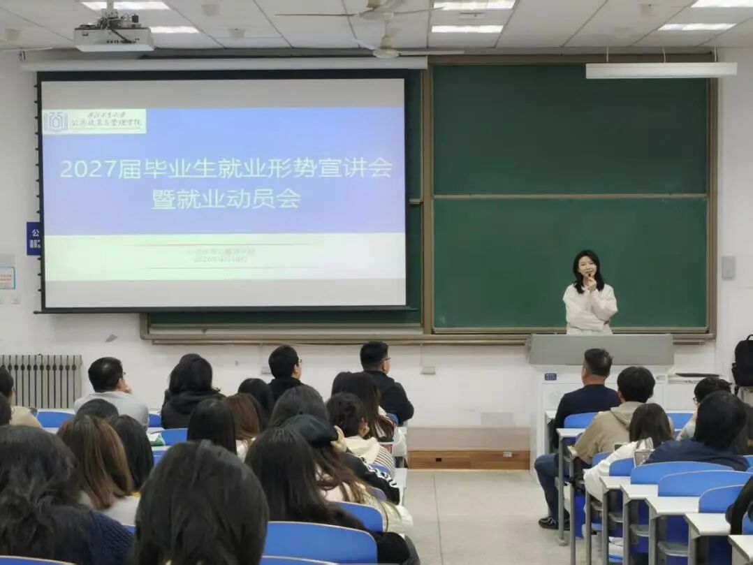 为深入推进学生就业指导服务,助力毕业生准确把握就业形势、科学规划发展路径、全面提升求职能力,4月10日,公共政策与管理学院顺利举办2027届毕业生就业形势宣讲会暨就业动员会。学校就业中心张林木老师应邀作专题讲解,学院党委副书记谢丹主持会议,团委书记薛智华、研究生辅导员仵荣鑫、本科生辅导员张悦、穆天以及2027届全体毕业生参加会议。