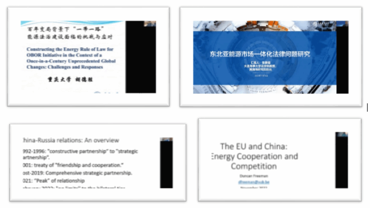重庆大学胡德胜教授以“百年变局背景下‘一带一路’”能源法治建设面临的挑战与应对”为题,分析了全球能源危机的根源,提出“坚持六项合作原则,加快发展能源领域软法”为路径的应对措施。大连海事大学张晏瑲教授以“东北亚能源市场一体化相关法律问题”为题,介绍了东北亚能源市场的现状,建议建立多边合作机制和专门针对能源贸易的区域争端解决机制。英国诺丁汉大学政治与国际关系学院副教授Lai Hongyi 博士分析了中俄能源合作关系的过去与未来走向,欧洲学院中欧研究中心研究员Duncan Freeman博士分析了中国和欧洲的能源关联,并在能源产业政策、能源贸易、中欧能源合作与竞争等方面为欧洲和中国的能源合作提出建议。