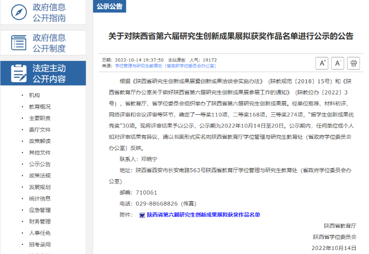 陕西省第六届研究生创新成果展的所有参展作品经单位推荐、材料初评、网络评审和会议评审等环节,确定了一等奖110项,二等奖168项,三等奖274项,“留学生创新成果优秀奖”30项。我院研究生在本届比赛中荣获一等奖的佳绩,充分体现了近年来学院对研究生培养工作的高度重视,以及我院研究生学术创新能力的显著提升,彰显了学院的办学水平和人才培养质量。
