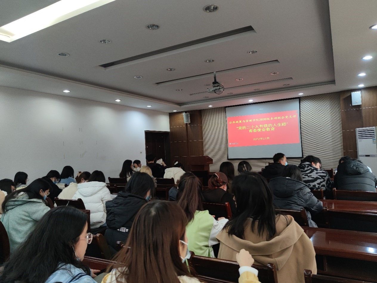 2022年11月16日,公共政策与管理学院2020级本硕联合党支部与2022级本硕联合党支部共同组织开展了以“党的二十大和我的人生路”为主题的青春使命教育活动,此次活动不仅覆盖两个支部的党员同志,同时鼓励支部的发展对象及积极分子参与,以主题党日活动为载体,先学一步、学深一层,用党的科学理论武装青年,用党的初心使命感召青年,深入学习贯彻党的二十大精神。