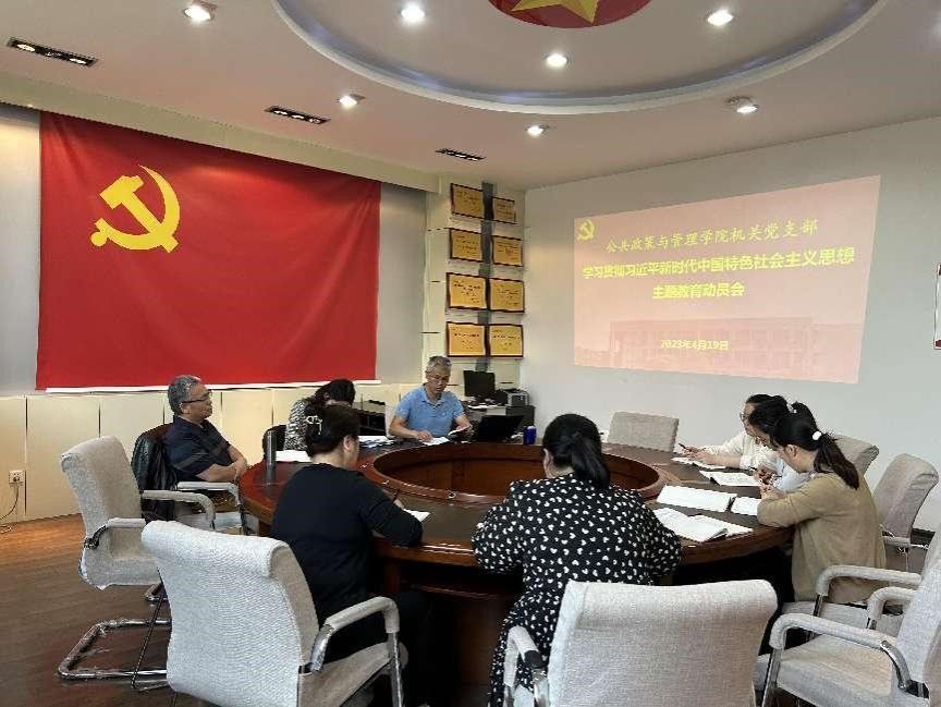 4月19日下午,公共政策与管理学院机关党支部在学院楼108会议室召开学习贯彻习近平新时代中国特色社会主义思想主题教育动员会,机关党支部党员参会。会议由支部书记宋武伟主持。