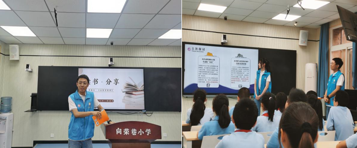 同时,向荣巷小学四年级和五年级的学生代表也先后分享了《三国演义》《水浒传》《红楼梦》《西游记》等经典名著,朗诵了《绿》《白桦树》等现代诗歌。最后,带班老师以及两名研究生给小朋友们赠送了西北工业大学的文创礼物,激励孩子们爱上阅读,享受阅读的乐趣。