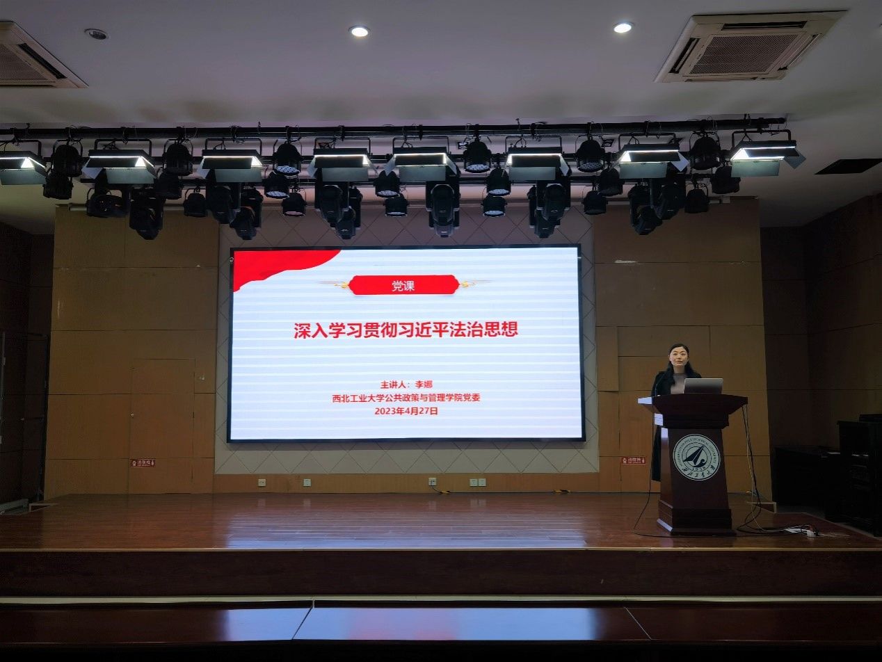 4月27日中午,公共政策与管理学院副院长李娜在长安校区为入党积极分子和发展对象讲授习近平法治思想专题党课。