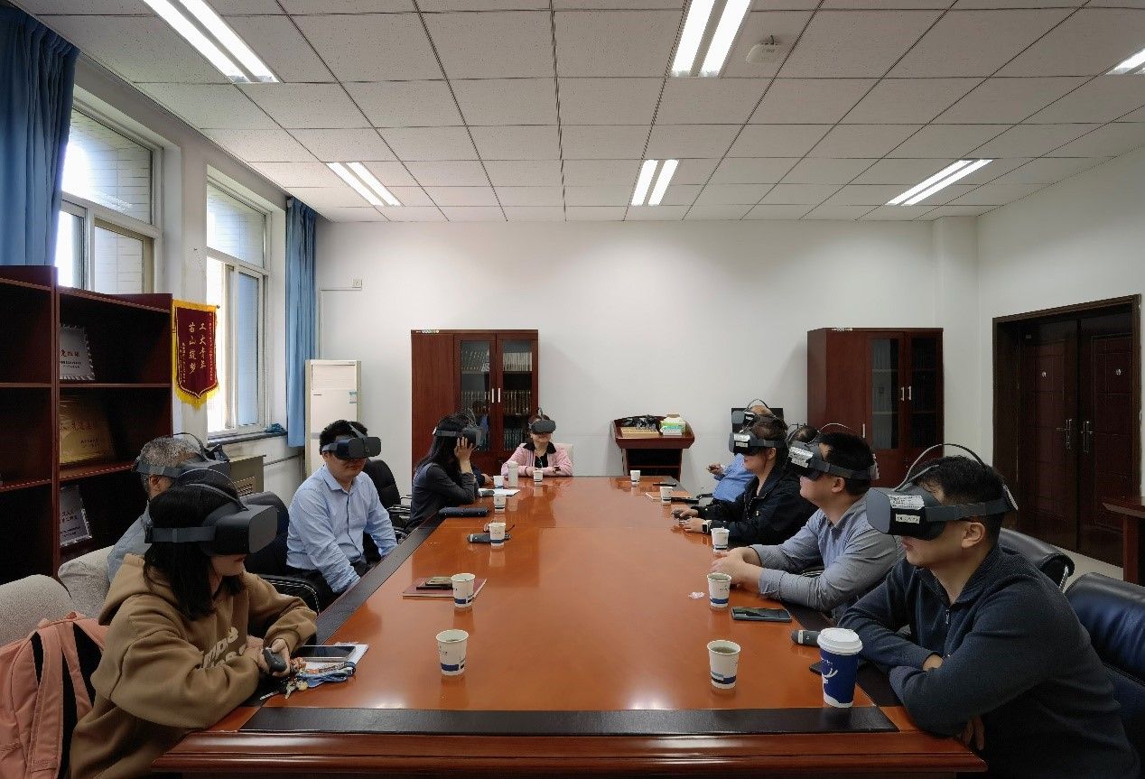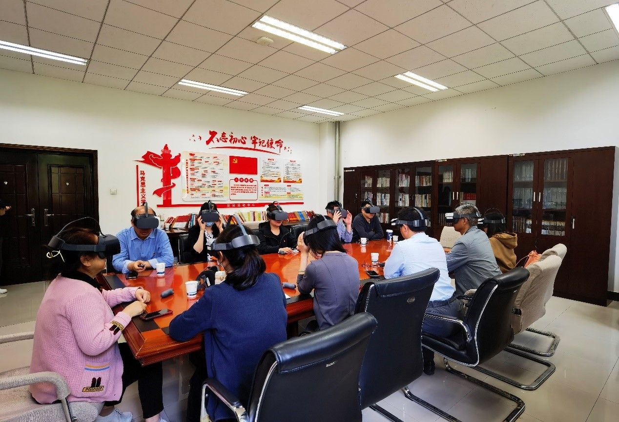 会上,院领导班子与师生党支部书记通过VR设备体验学习了“党史教育体验馆”“红色时空馆”等模块内容,身临其境沉浸式进行了学习。大家充分交流学习感悟,表示在读原著学原文的基础上,进行VR体验式学习,实实在在强化了学深悟透的效果。