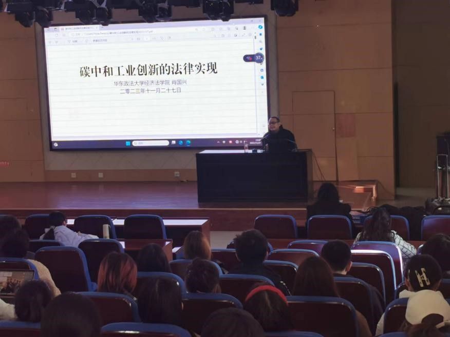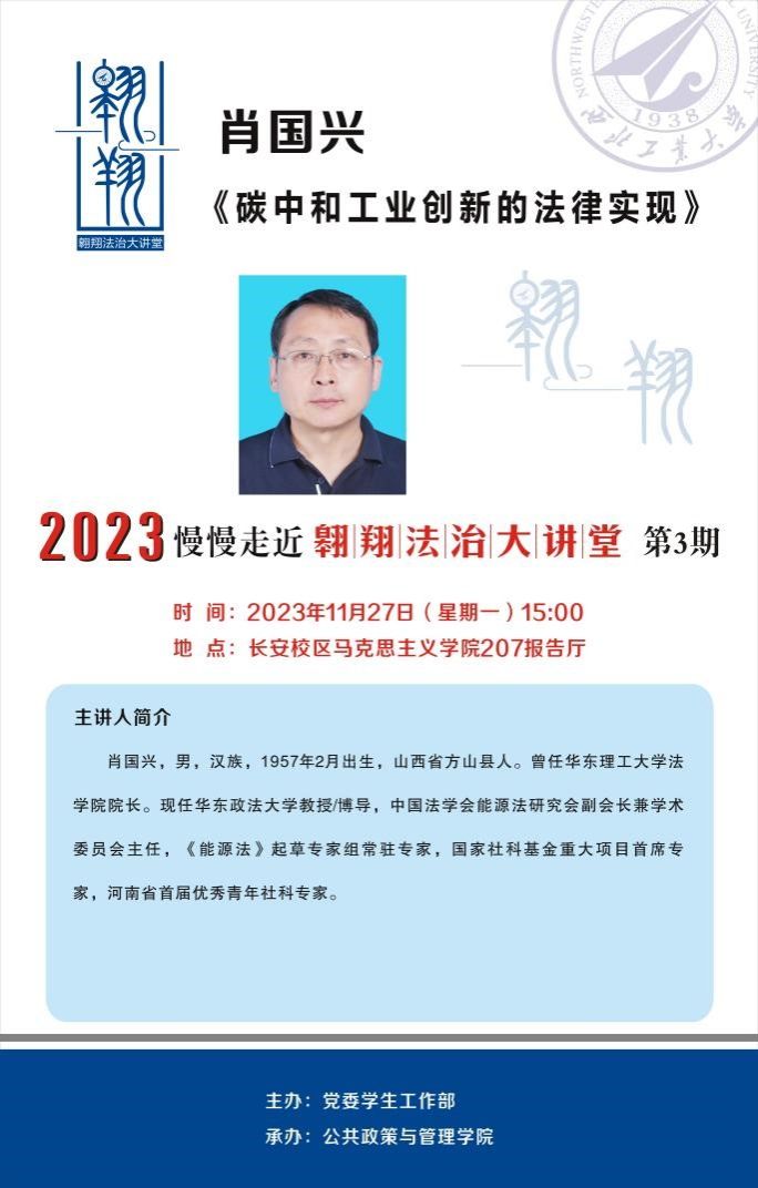 11月27日下午,西北工业大学2023年第三期“翱翔法治大讲堂”在长安校区207报告厅举办。本次活动由学校党委学生工作部主办,公共政策与管理学院承办,华东政法大学教授、博士生导师、中国法学会能源法研究会副会长兼学术委员会主任、《能源法》起草专家组常驻专家、国家社科基金重大项目首席专家、河南省首届优秀青年社科专家肖国兴教授应邀为作题为《碳中和工业创新的法律实现》的专题讲座。讲座由公共政策与管理学院副教授王涛主持。