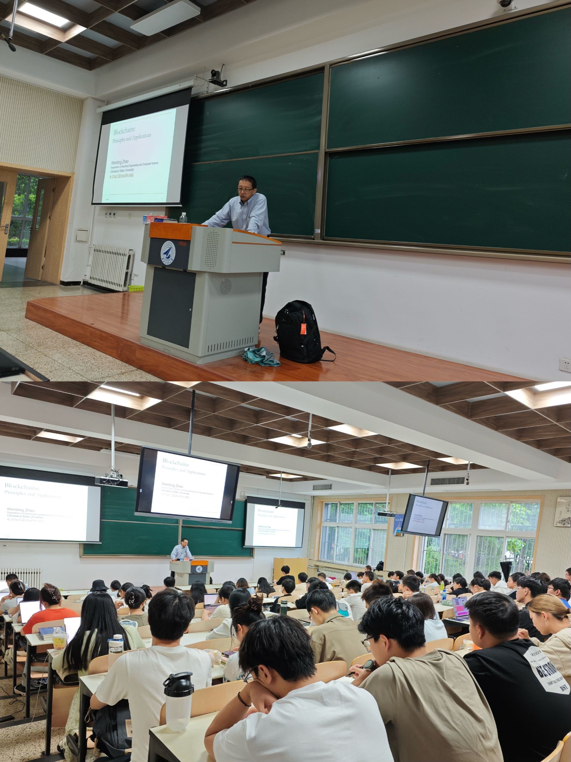 公共政策与管理学院周炯教授邀请美国克利夫兰州立大学教授Wenbing Zhao讲授《区块链原理与应用/Blockchains: Principles and Applications》课程。Wenbing Zhao通过介绍区块链技术产生、原理及维护等基本知识和技能应用领域,以比特币为例,使学生深入了解区块链的发展历史、技术进步和应用创新,掌握区块链密码技术、共识机制等基本原理和实际应用,学会运用“区块链思维”分析和研究各行业的区块链应用程序。