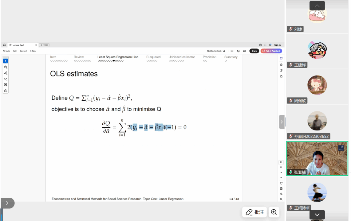 刘婕副教授邀请牛津大学高级研究员Yanan Zhang高级研究员讲授《社会科学研究计量与统计方法/Econometrics and Statistical Methods for Social Science Research》课程。课程系统介绍计量经济学与高级统计方法,融合理论讲解与实际操作。内容涵盖线性回归、广义线性模型、工具变量法、面板数据分析(固定效应与随机效应)、倾向得分匹配(PSM)以及双重差分法(DID)等关键方法,帮助学生掌握实证研究中的核心技能,提升数据分析与研究设计能力。