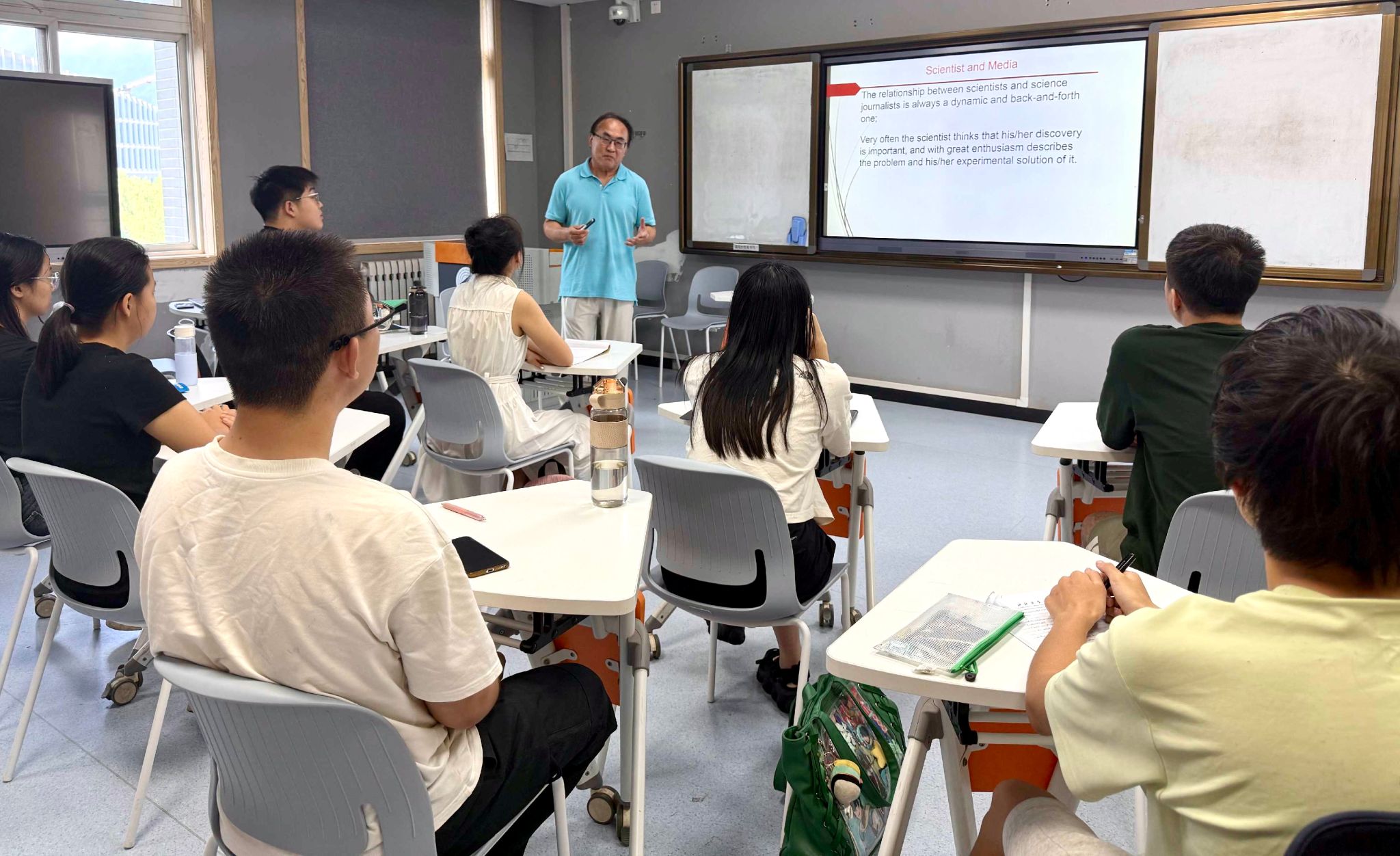 张婧文副教授邀请美国密苏里大学教授Zhigang Sun讲授《科学素养基础/The Fundamentals of Science Literacy》课程。课堂旨在帮助学生理解科学素养的重要性、科学传播的流程及挑战、辨析科学信息真伪的做法和科学探究过程中需要的理论、方法等。Zhigang Sun引用近期社会热点事件和相关学术论文,结合新闻传播学知识,从各个角度全面讲授科学素养、科学传播方面的知识,并鼓励学生思考、讨论,启发学生运用批判性思维、发散性思维处理和解决问题,锻炼他们不迷信权威、勇于质疑、勇于创新、严谨求真的科学素质,以此加深学生对科学素养的理解,提升学生的科学素养水平。