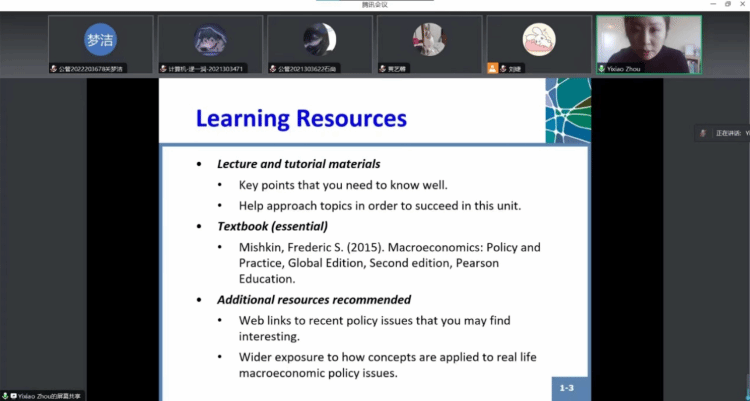 公共政策与管理学院刘婕副教授邀请澳大利亚国立大学克劳福德公共政策学院Arndt-Corden经济系副教授Yixiao Zhou讲授《宏观经济学原理:政策和实践/Macroeconomic Principles: Policy and Practice》课程。课程内容围绕宏观经济的理论和政策实践,首先阐述了宏观经济中的重要变量;其次运用宏观经济学模型分析了经济周期;最后评估宏观经济政策对经济周期的影响。